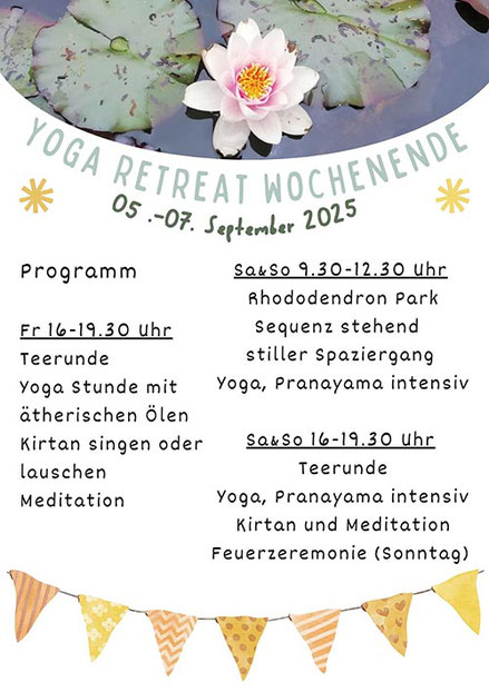 Das Wochenende beinhaltet 5 Yoga Stunden, geführte Meditation, meditative Spaziergänge und Musik.